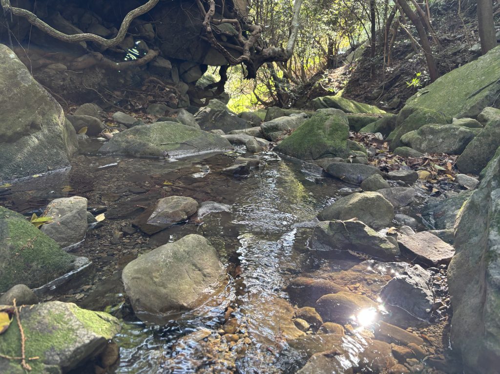 サワガニを探しに来たのは、山の中の木に囲まれつつも、少し陽光が当たるような場所です。